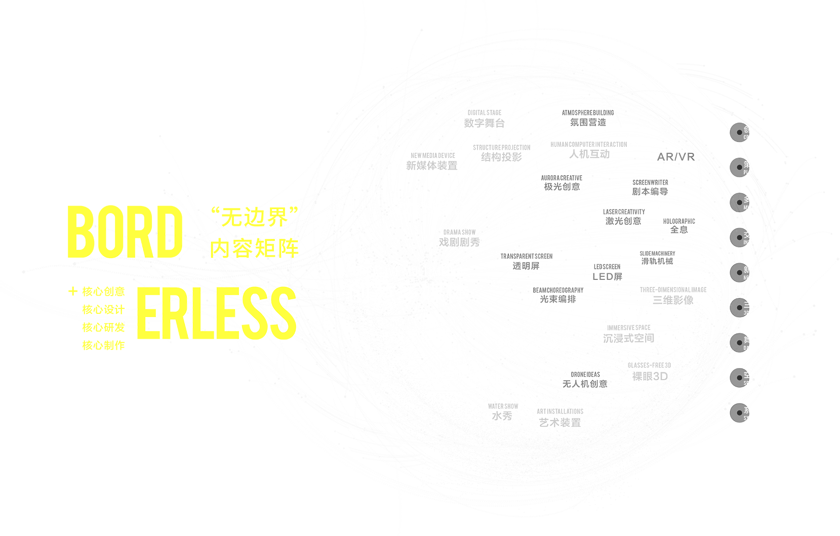 场景打造、装置打造、舞美编排、交互软件开发、集成系统开发、动画制作、三维特效、CG动画、材质渲染、后期合成、灯光编排、效果及演示,等